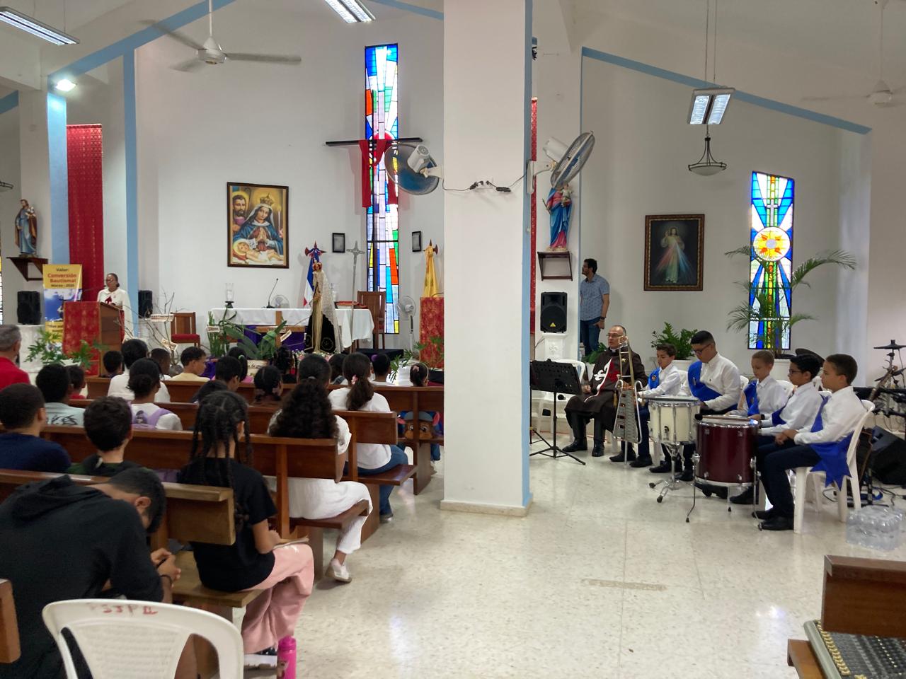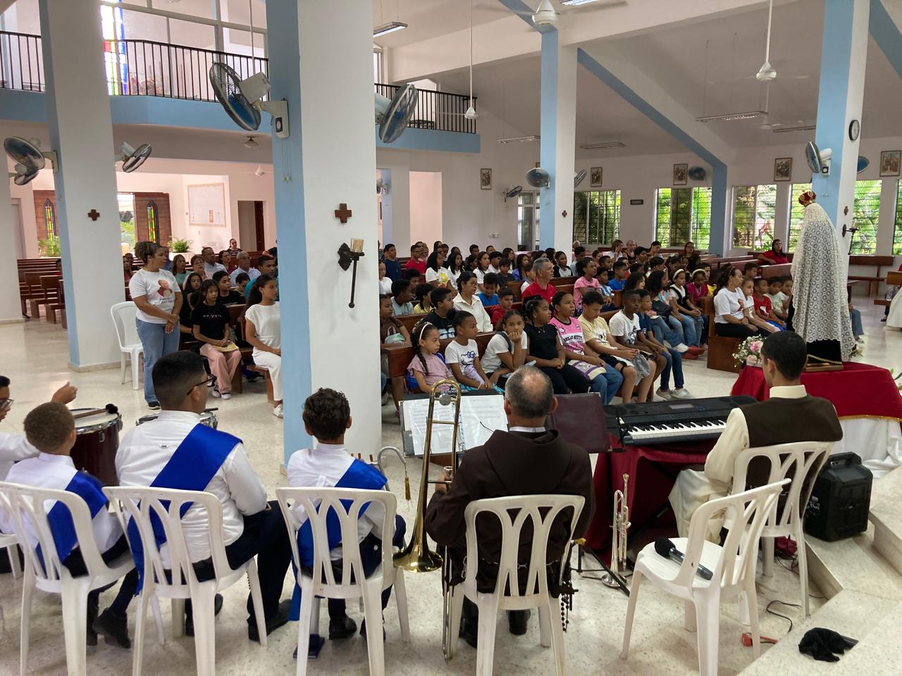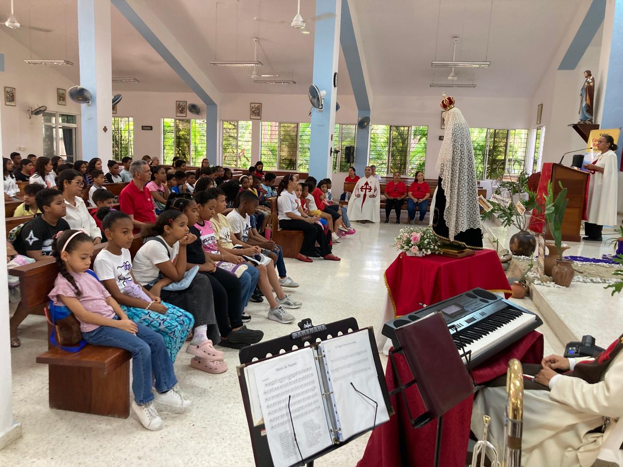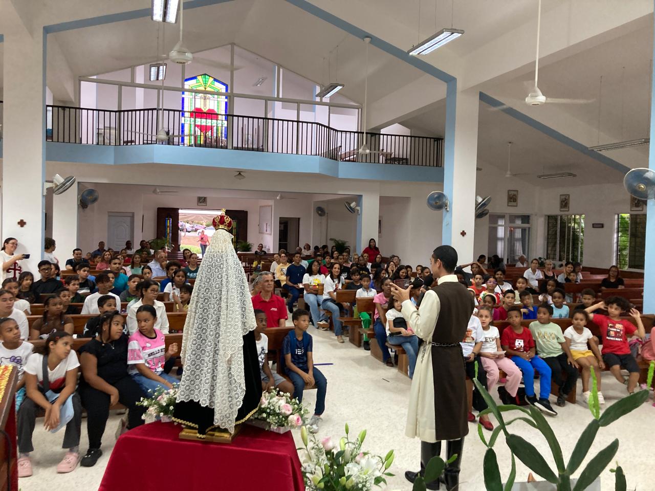 La actividad, dirigida por el Padre Juan Bautista Méndez, reunió a cerca de 90 personas entre padres de familia y niños, quienes compartieron un momento de oración y formación cristiana, fortaleciendo la fe y la vida comunitaria.